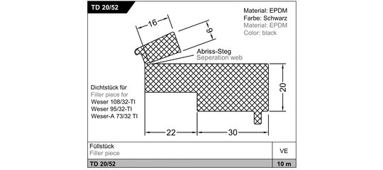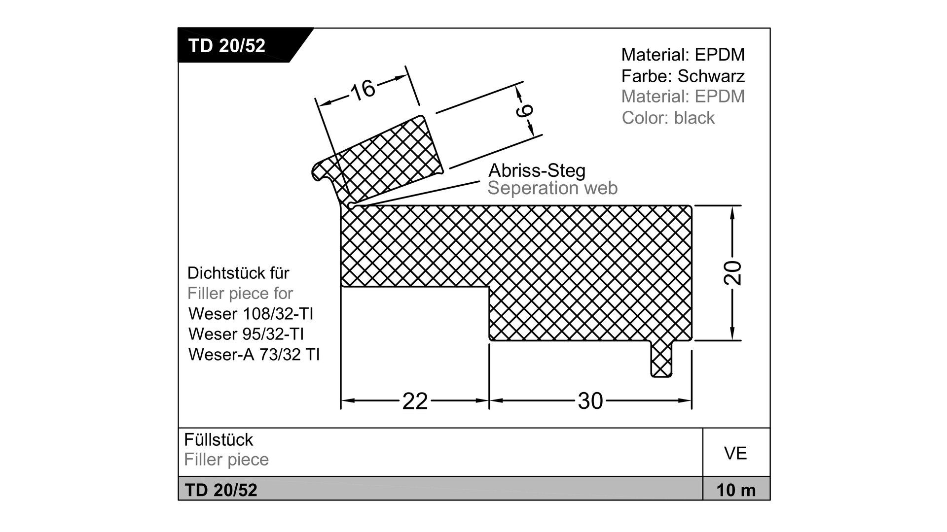 Dveřní těsnění TD 20/52 pro prahy Weser 108/32-TI, 95/32-TI, A73/32-TI