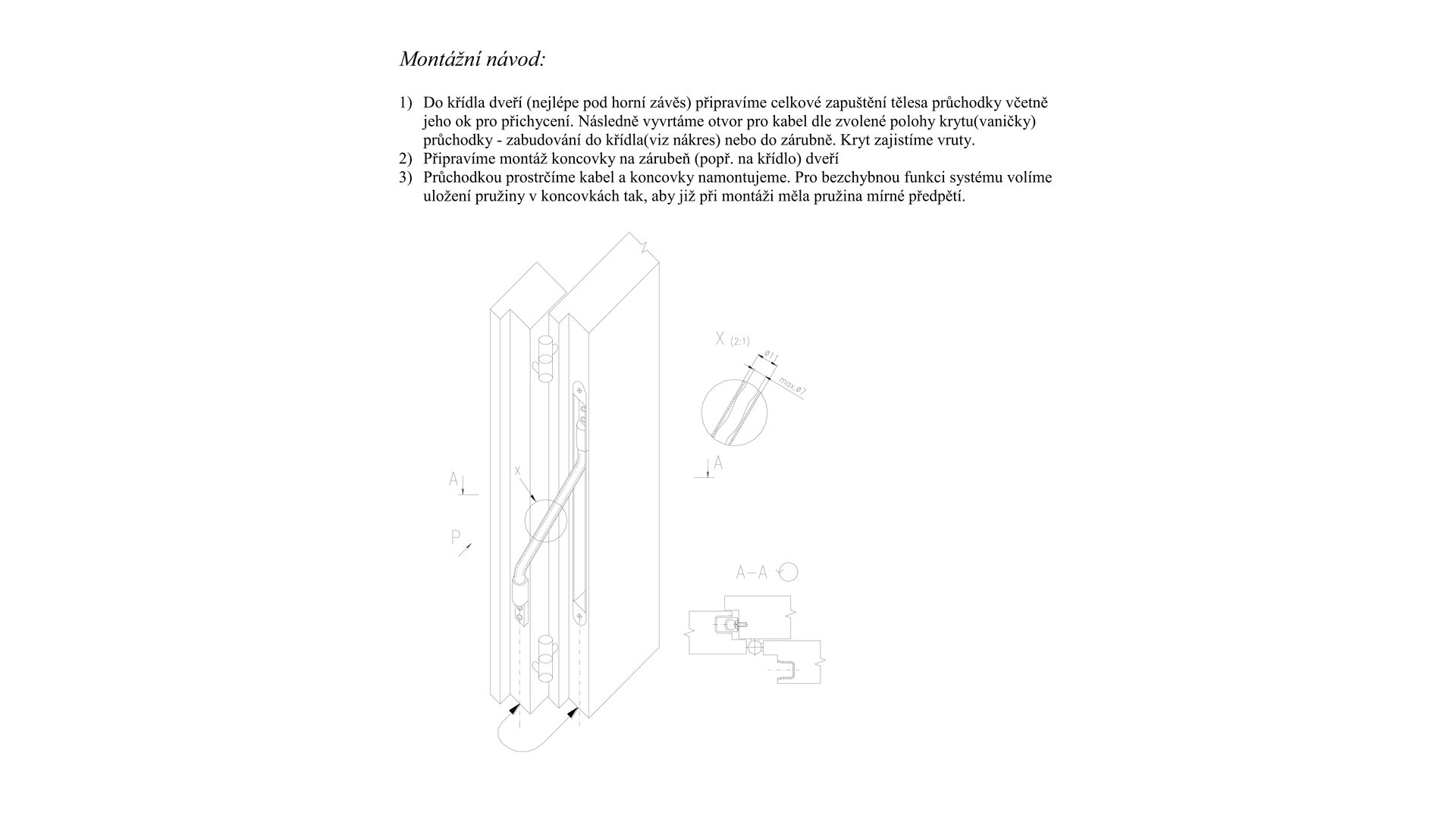 Kabelová průchodka umožňuje bezpečný průchod kabelu skrze zárubeň a křídlo dveří k elektrickému zámku.