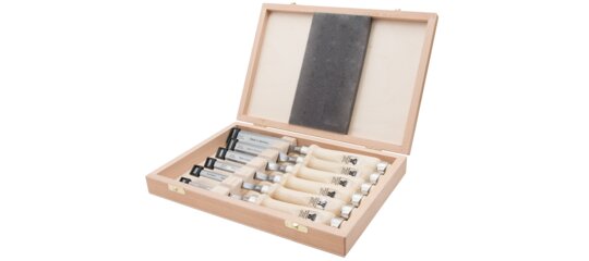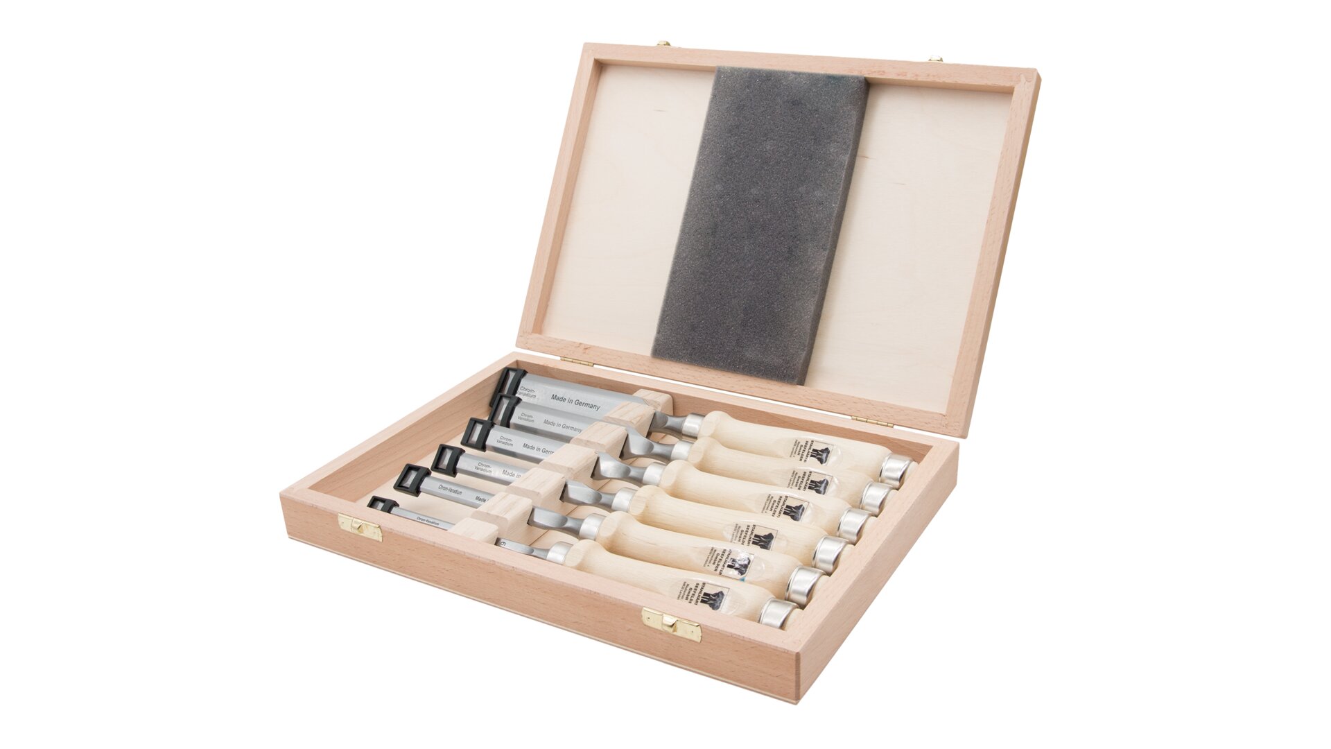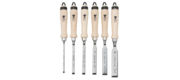 6dílná sada dlát v dřevěné krabičce. Vyrobeno z vysoce kvalitní nástrojové oceli s habrovou rukojetí.