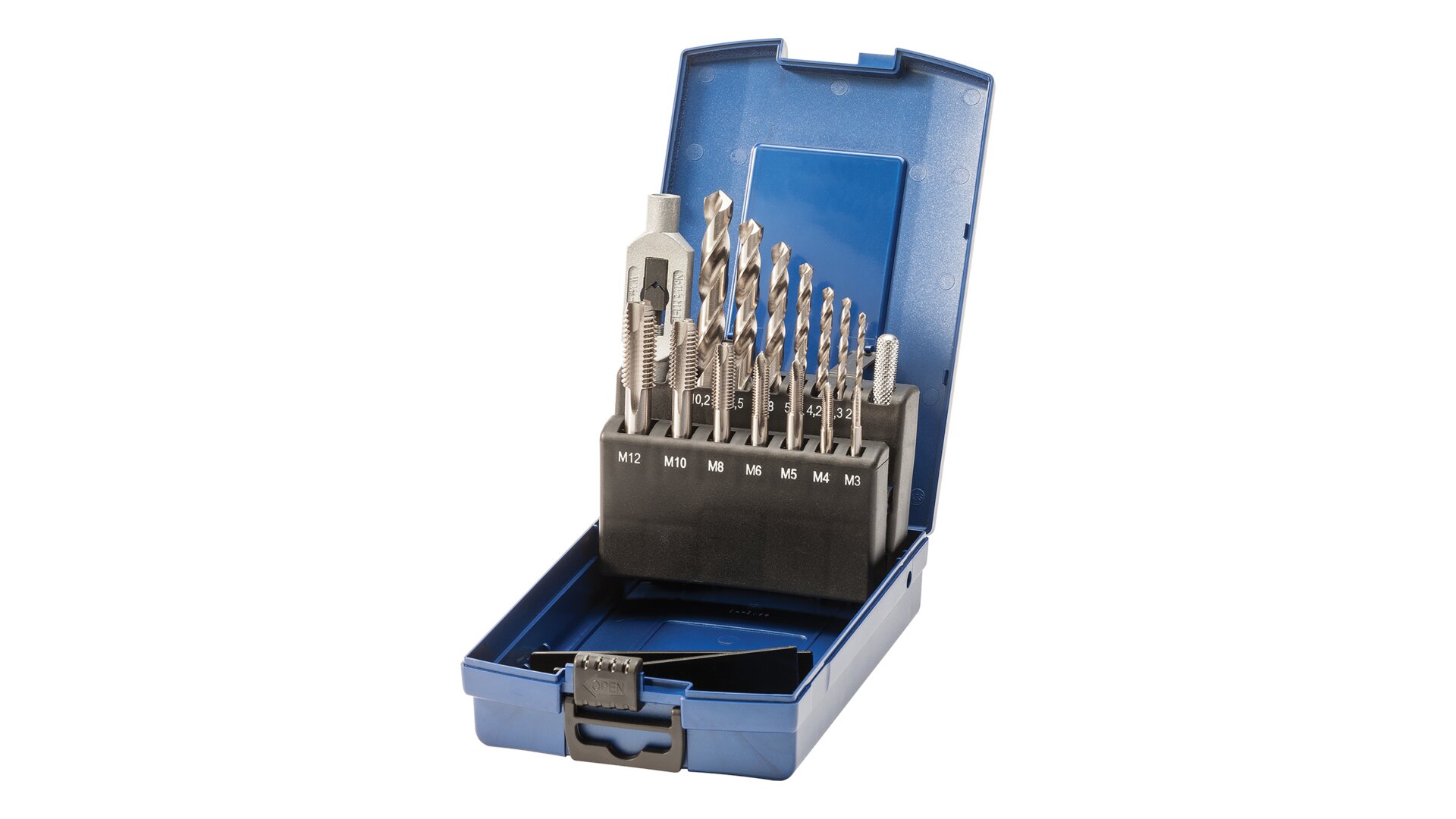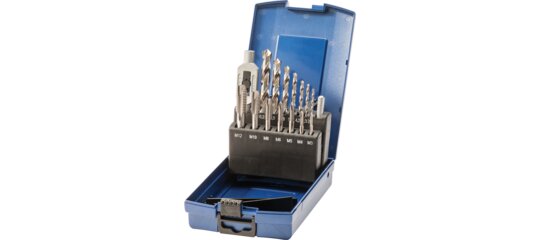Praktická sada v kompaktní polystyrenové kazetě pro řezání závitu. Řemeslníci jsou optimálně vybaveni závitořeznými klíči, jednobřitými závitníky a spirálovými vrtáky.
