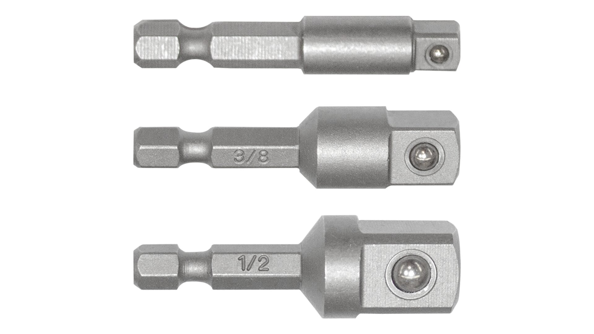 Třídílná sada spojovacích dílů STAHLHÄRTER umožňuje připojení tří různých čtyřhranných pohonů k šestihranu 1/4".