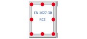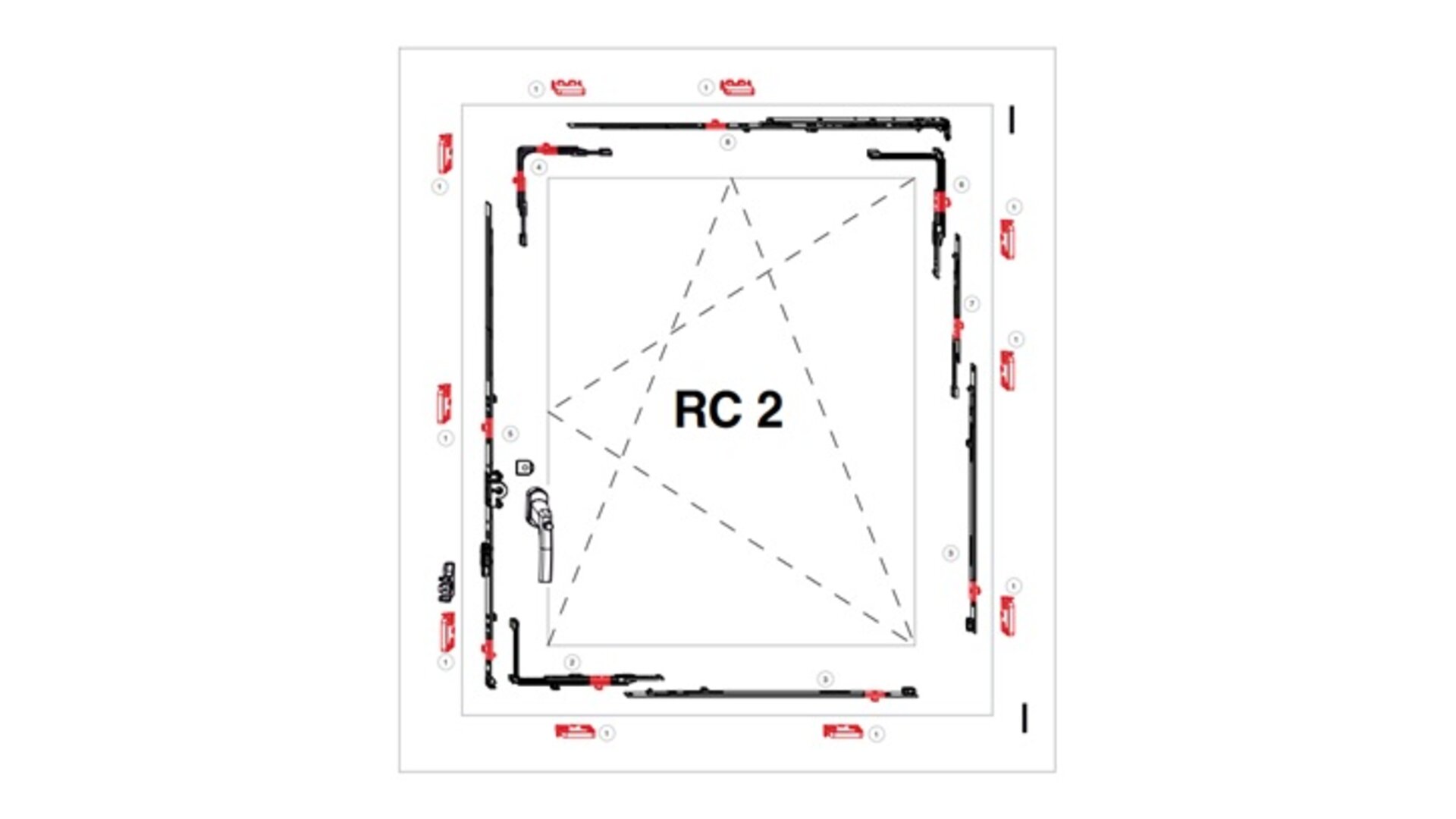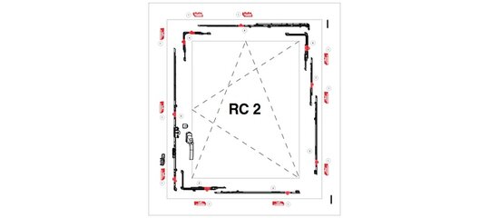 Nejvhodnější řešení je vyhnout se kompromisům a zakovat okna normovaným bezpečnostním kováním ve třídě RC2 (dříve WK2). Červená kolečka symbolizují bezpečnostní zamykací body.