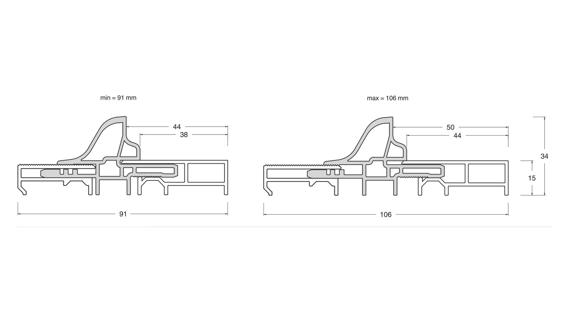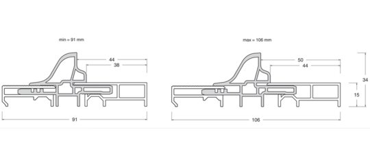 BODENTÜRSCHWELLE TRANSIT AUSZIEHBAR FÜR ANSCHLAGDICHTUNG MIT THERMISCHER TRENNUNG S=91-106MM F1 L=5.000MM H=34 MACO